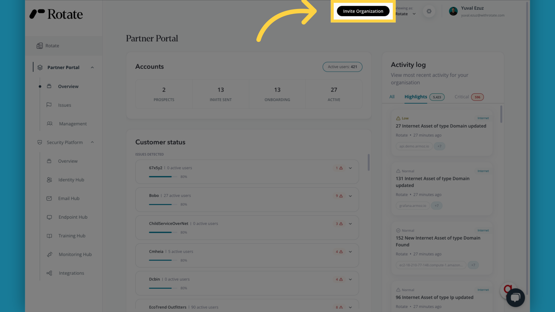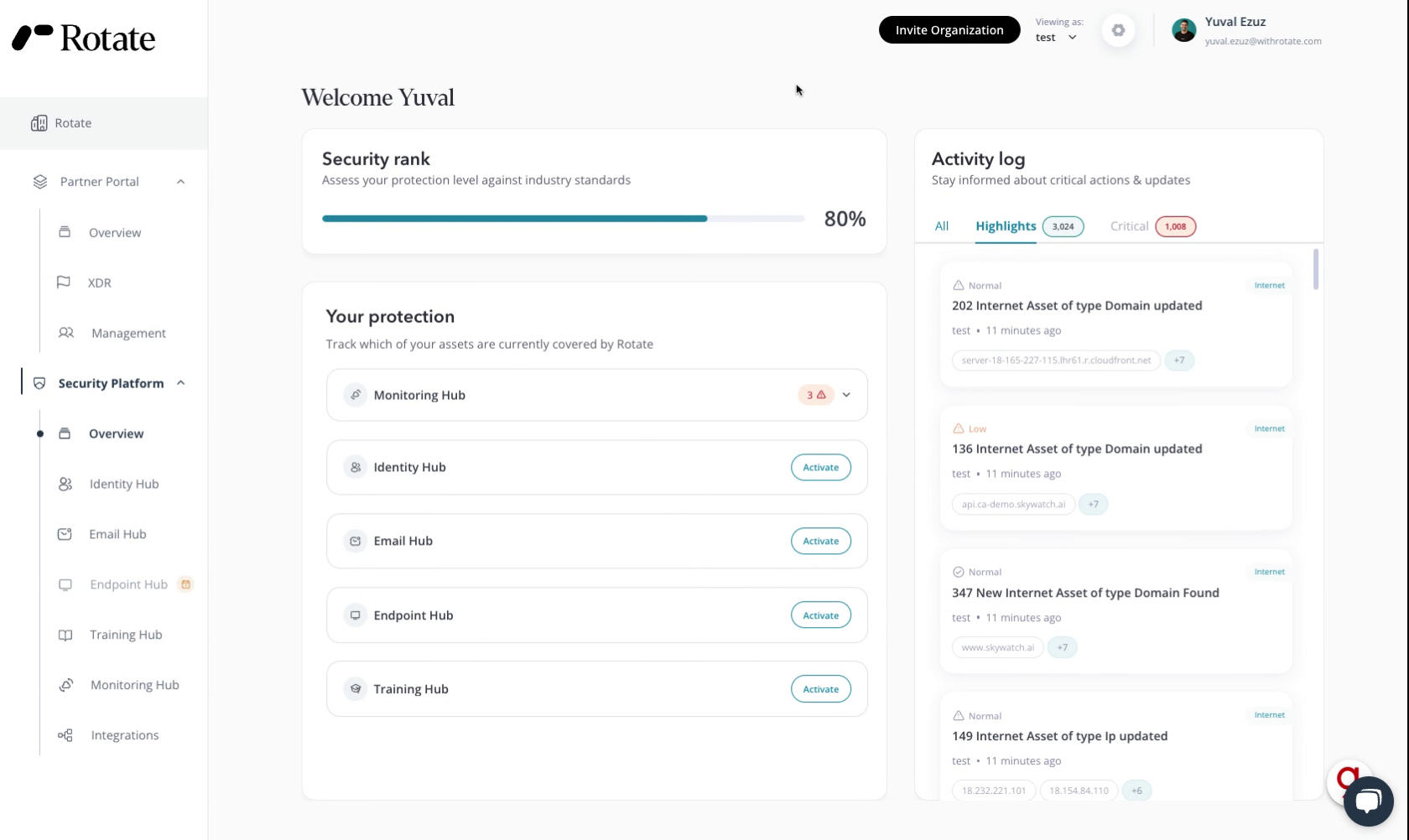Getting StartedGetting StartedGetting StartedExplore the Rotate platform to better secure your organization.Knowledge BaseExplore articles and resources to boost your knowledge.FAQsFind quick answers to your and others most common questions.Video TutorialsExplore our video library to learn more about Rotate features.What's NewExplore our video library to learn more about Rotate features.Getting started videosHow to Onboard a New Customer to RotateManagement1 minHow to Invite a User to Rotate's DashboardManagement1 minHow to give Rotate permissions to Reset user Password upon next loginRemdiations1 minPopular TopicsHow to Suspend or Delete a User from a Rotate Accountaccount management1 minHow to set up a Rotate Account as an Organization Adminaccount management2 minHow to set up a Rotate account as an MSPaccount management2 minSign Ins - Uses for Detection and Common TrendsIncident ResponseKey Components of Effective Security PoliciesPolicies3 minEnhancing Identity Security with Rotate's Identity HubTeam Management4 minIntroducing 'Dig Deeper' - AI-Powered Insights for Security IssuesAI-Driven Security Tools5 minWhat is External Attack Surface Management (EASM)?Introduction5 minInstalling Rotate’s Sensor on WindowsInstallation Guides5 minInstalling Rotate’s Sensor on MacOSInstallation Guides5 minKey Features of the XDR PlatformSecurity3 minOn this pageGetting Started VideosPopular Topics